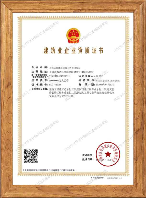 上海天瀾建筑裝飾工程有限公司由熱愛裝修事業(yè)的專業(yè)人士創(chuàng)辦,經(jīng)上海工商行政管理局注冊(cè)登記的專業(yè)上海工裝公司。天瀾建筑裝飾注冊(cè)資本5000萬(wàn),擁有建筑施工總承包三級(jí),鋼結(jié)構(gòu)工程專業(yè)承包三級(jí)建筑裝飾工程專業(yè)承包二級(jí),建筑機(jī)電設(shè)備安裝專業(yè)承包三級(jí),消防設(shè)施工程專業(yè)承包二級(jí)等資質(zhì)。國(guó)家建筑裝飾裝修工程設(shè)計(jì)與施工二級(jí)資質(zhì)單位、上海市建筑裝飾裝修行業(yè)協(xié)會(huì)會(huì)員單位、有上海市建設(shè)和交通委員會(huì)頒發(fā)的“安全生產(chǎn)許可證”。